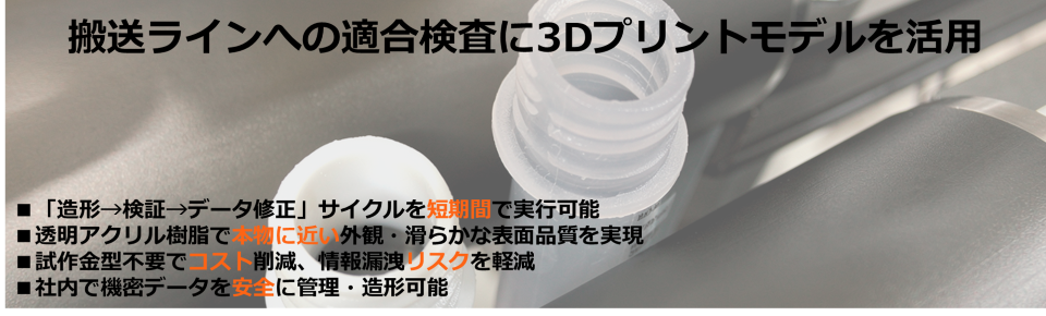 製造ラインの搬送検証に必要な試作金型は高額で時間も掛かるうえ、CADデータは非開示。そこで口頭ヒアリングをもとにサロゲート部品を3Dプリントで短納期造形し、初回テストで詰まりを発見、2回目でクリア。200万円超のコスト削減を実現した革新的プロセスとは?