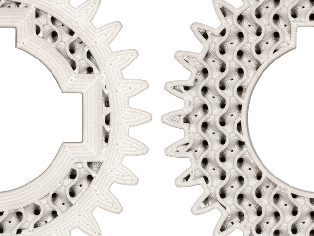 ヒートチャンバーの採用とDesktop Metalで設計されたプリント・プロファイルにより、焼結直後の状態で優れた表面仕上げが得られ、高強度のジャイロ・インフィル構造が部品の軽量化を実現します。
